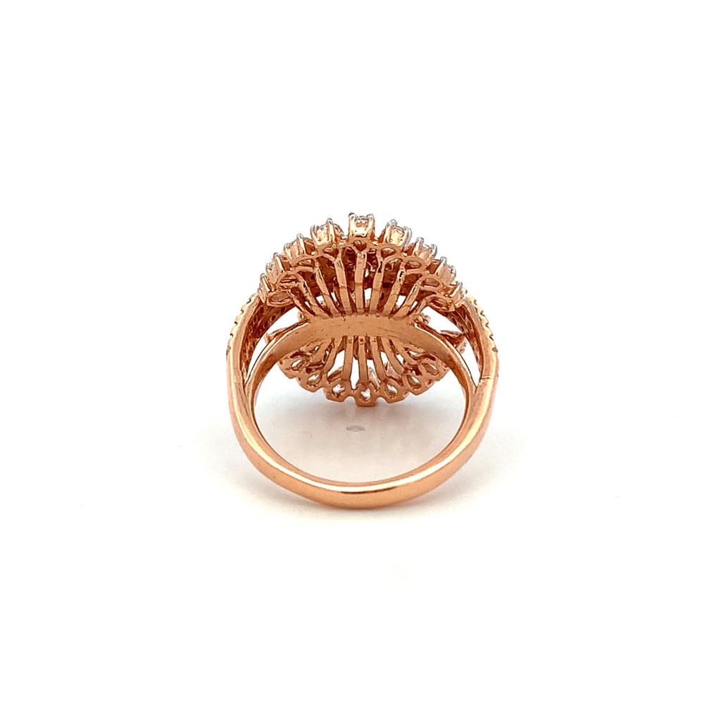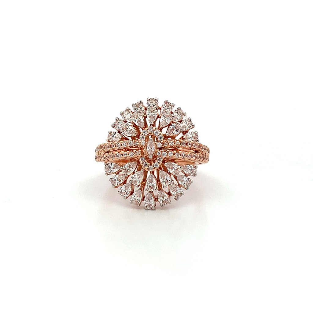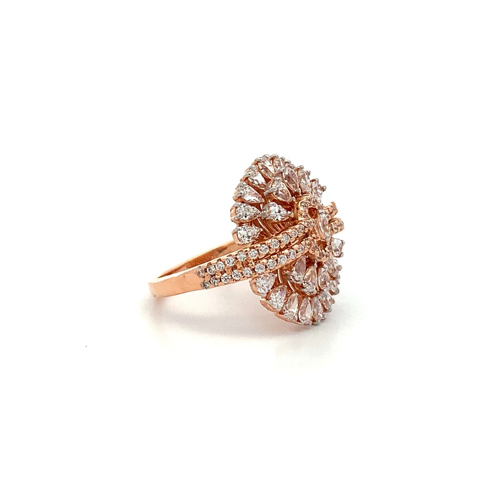 BE ENAMOURING AND ALLURING WITH THIS CAPTIVATING FLOWER BLOSSOM FINGER RING CRAFTED IN 18 KT ROSE GOLD AND STUDDED WITH AMERICAN DIAMONDS BY PAIRING IT WITH YOUR WESTERN ANSEMBLES.