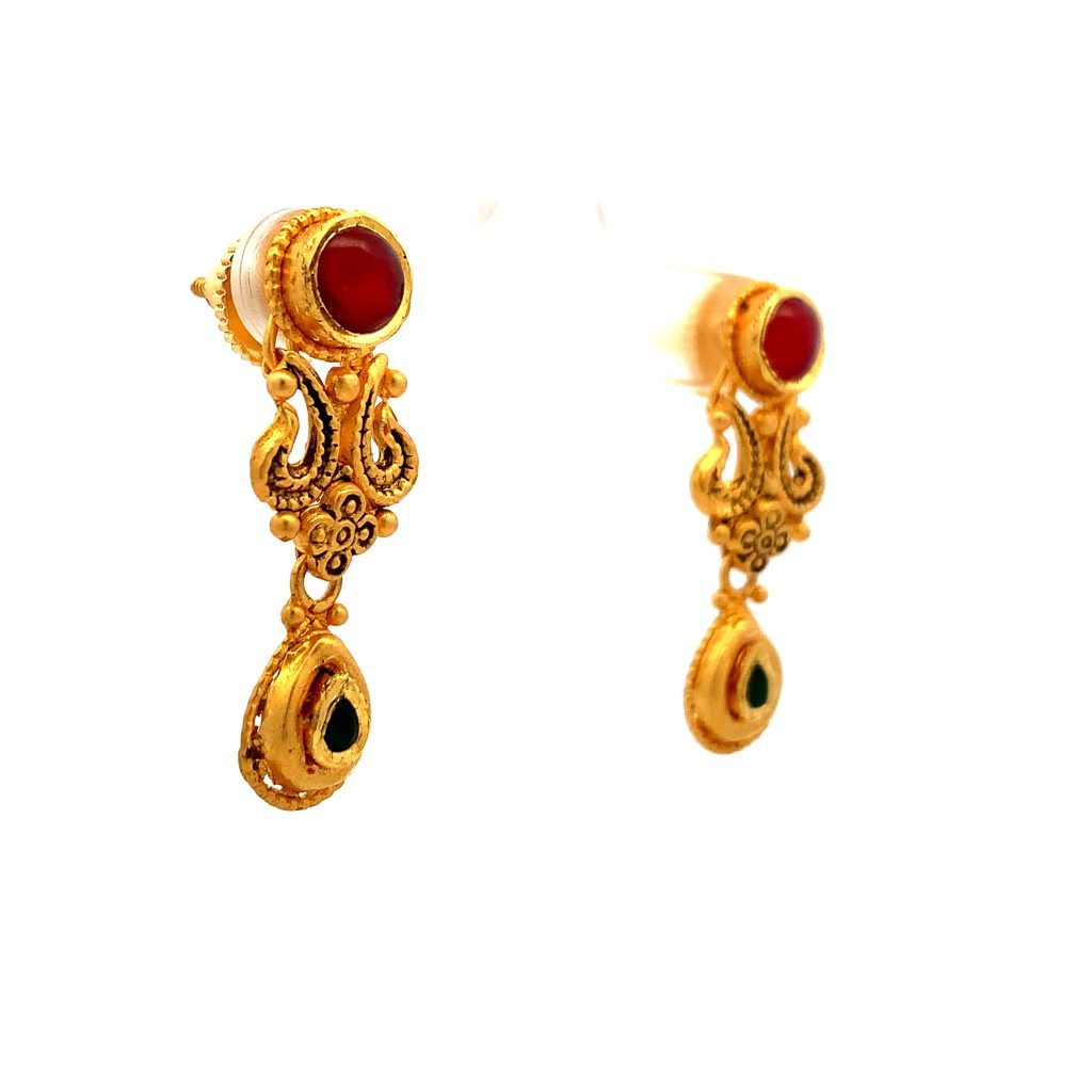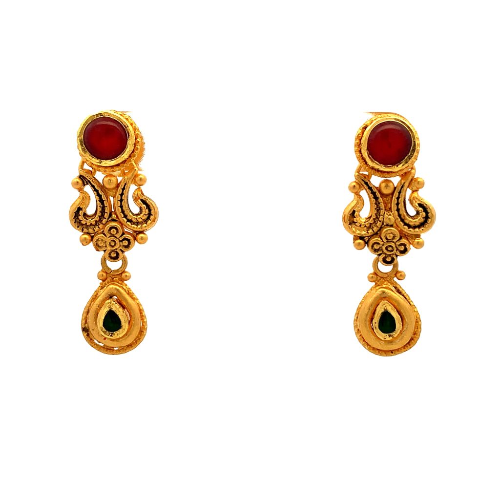 STYLE UP WITH THIS ARTISTIC 22 KT GOLD ANTIQUE DANGLING EARRINGS STUDDED WITH KUNDAN AND RED STONES.